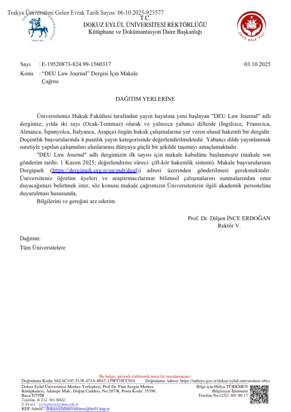 “DEU LAW JOURNAL” DERGİSİ İÇİN MAKALE ÇAĞRISI