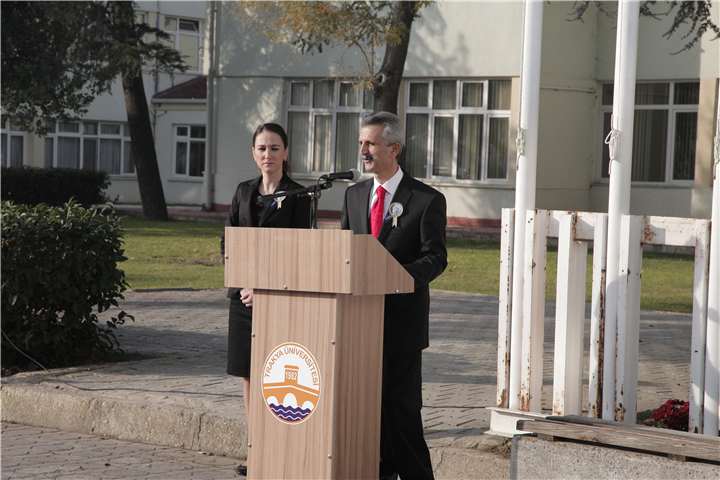 Saygı Duruşu ve İstiklal Marşı’nın okunmasının ardından Edebiyat Fakültesi Tarih Bölümü Öğretim Üyesi Yrd. Doç. Dr. Bülent ATALAY tarafından ‘’Milli Liderimiz Atatürk’’ konulu günün anlamıyla ilgili bir konuşma yapıldı.