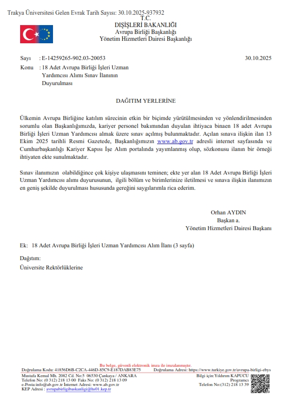 18 ADET AVRUPA BİRLİĞİ İŞLERİ UZMAN YARDIMCISI ALIMI SINAV İLANININ DUYURULMASI