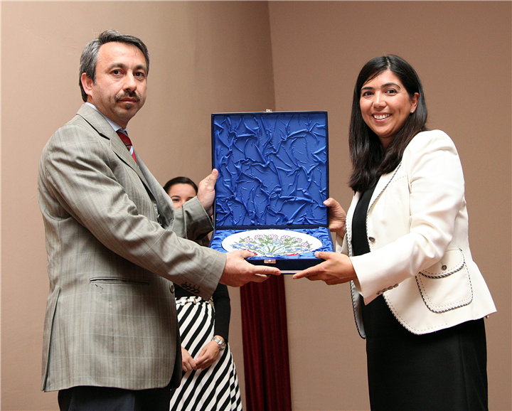 Konferans sonunda Rektör Prof. Dr. Yener YÖRÜK, Aygül ÖZKAN'a günün anısına hediye verdi.