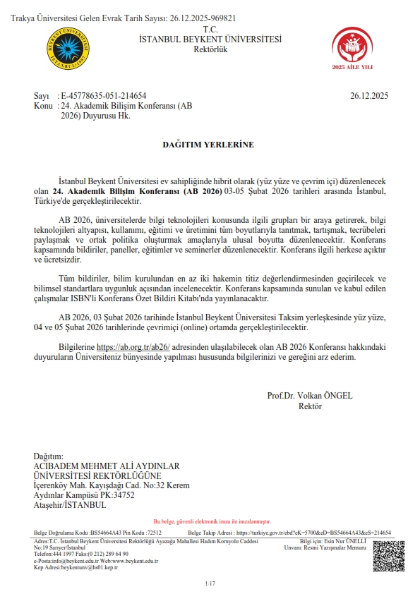 24. AKADEMİK BİLİŞİM KONFERANSI (AB 2026) DUYURUSU HK.