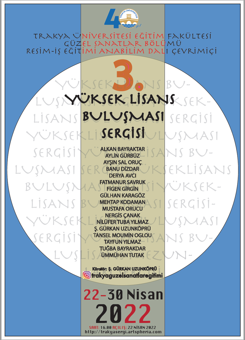 Trakya Üniversitesi’nin 40.yıl etkinlikleri kapsamında, Eğitim Fakültesi, Sosyal Bilimler Enstitüsü ve Şehit Ressam Hasan Rıza Güzel Sanatlar Meslek Yüksekokulu iş birliği ile küratörlüğünü Öğr. Gör. Ş. Gürkan Uzunköprü’nün yaptığı “3. Yüksek Lisans Buluşması” isimli karma sergi düzenlenecektir. Sosyal Bilimler Enstitüsü Güzel Sanatlar Eğitimi Anabilim Dalı, Resim-İş Eğitimi Bilim Dalı yüksek lisans mezunu ve eğitimine devam eden öğrencilerinin katılımlarıyla gerçekleştirilecek sergiye 22 Nisan 2022 Cuma günü saat 16.00’da erişim sağlanabilecek.