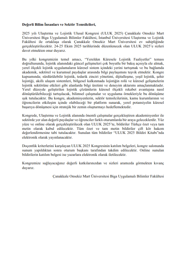 9. ULAŞTIRMA VE LOJİSTİK ULUSAL KONGRESİ HK.
