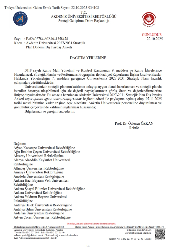 AKDENİZ ÜNİVERSİTESİ 2027-2031 STRATEJİK PLAN DÖNEMİ DIŞ PAYDAŞ ANKETİ