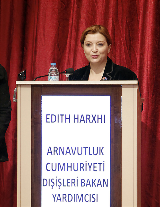 Arnavutluk Cumhuriyeti Dışişleri Bakan Yardımcısı Edith HARXHI sözlerini şu şekilde sürdürdü: “Özellikle son 20 senede Arnavut-Türk ilişkilerinin bu denli yakın ve düzenli şekilde ilerleyişini Kosova’nın kendi bağımsızlığını kazanmasına dayandırıyorum. Kosova’nın hikâyesi zannediyorum ki herkes için çok acıklı bir hikâyedir. Bu sadece Türkiye ve Arnavutluk açısından değil bütün dünya için böyledir.