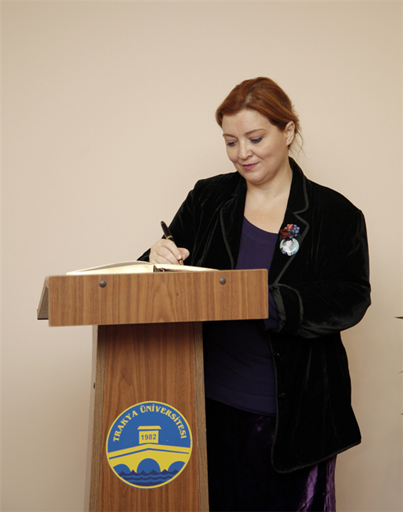 Arnavutluk Cumhuriyeti Dışişleri Bakan Yardımcısı Edith HARXHI ile beraberindeki heyet, 5 Aralık 2012 tarihinde üniversitemizi ziyaret etti. Rektör Prof. Dr. Yener YÖRÜK, Dışişleri Bakanlığı Edirne Temsilcisi Metin KILIÇ ve rektör yardımcıları, konuk bakan yardımcısını Balkan Kongre Merkezi’nde karşıladılar.
