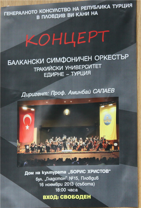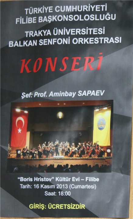 Üniversitemiz Balkan Senfoni Orkestrası, 16 Kasım 2013 tarihinde Filibe Boris Hristov Kültür Merkezi’nde Filibe Başkonsolosluğu’nun daveti üzerine konser verdi.
