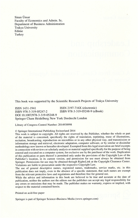 Trakya Üniversitesi İktisadi ve İdari Bilimler Fakültesi Öğretim Üyesi Doç. Dr. Agah Sinan ÜNSAR’ın Contributions to Management Science serisinden “Leadership and Communication: A Case from Glass, Textile and Apparel Sector in Turkey” adlı uluslararası kitabı Springer yayınevi tarafından yayımlandı.