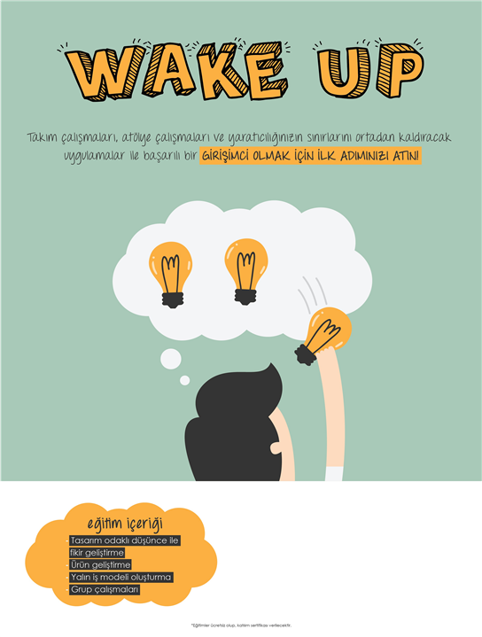 17-21-27 Nisan 2017 tarihlerinde saat 14:00-18:00 arasında Trakya Teknopark'ta gerçekleşecek olan Wake Up Programı; kendi işini kurmak, yenilikçi metotları kullanarak inovatif iş fikirleri bulmak ve hayallerini gerçekleştirmek isteyen üniversite öğrencilerini çağırıyor. Tasarım odaklı düşünce (design thinking) ile fikir geliştirme, ürün geliştirme ve yalın iş modeli oluşturmayı kapsayan yaklaşık 3 haftalık uygulama ağırlıklı bir eğitim yapılacaktır.
