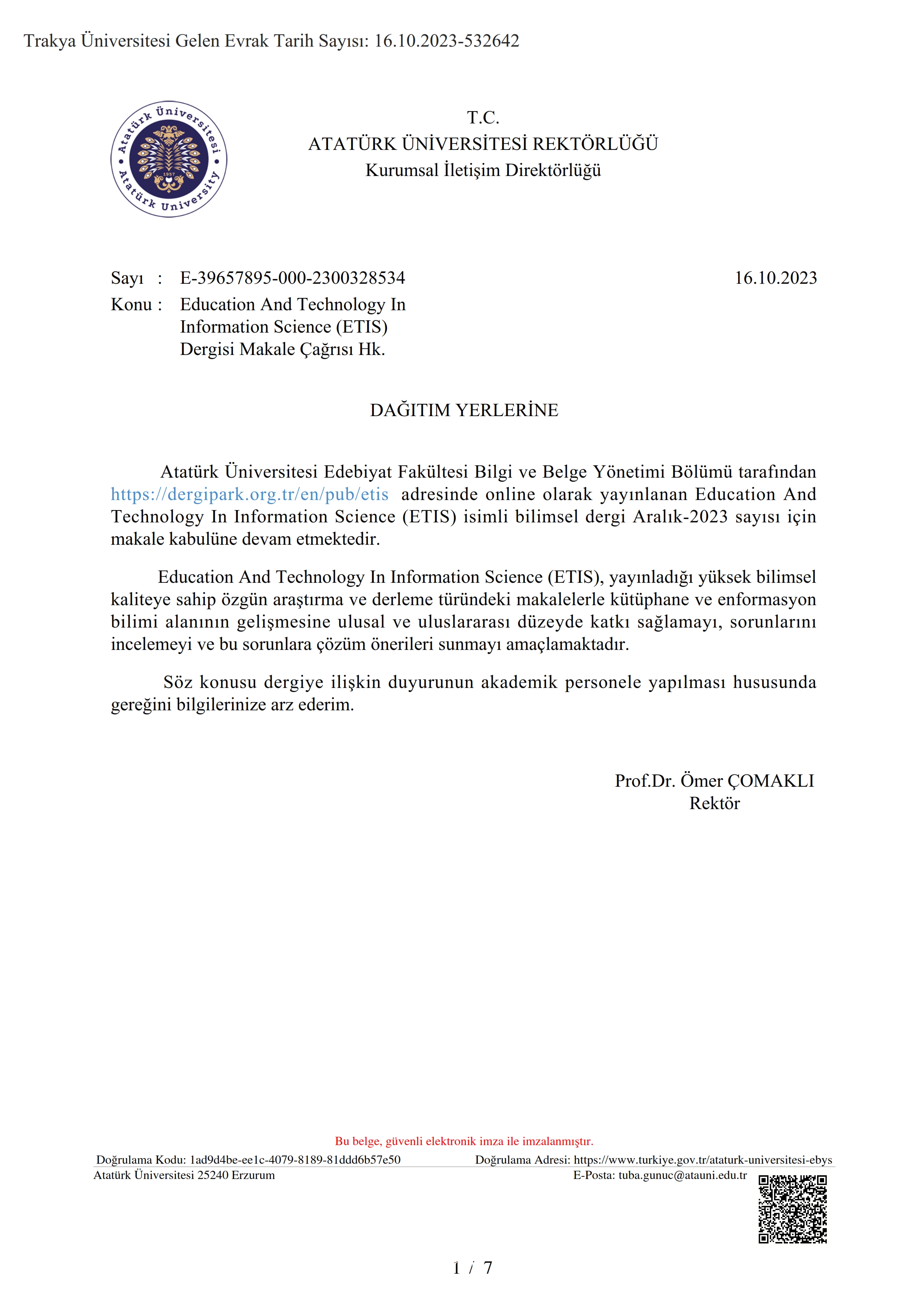 EDUCATİON AND TECHNOLOGY IN INFORMATİON SCİENCE (ETIS) DERGİSİ MAKALE ÇAĞRISI HK.