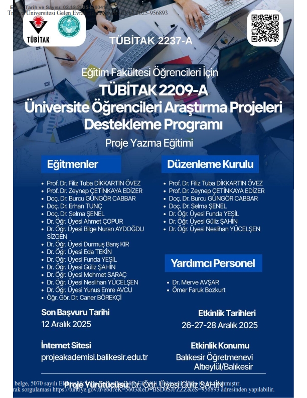 EĞİTİM FAKÜLTESİ ÖĞRENCİLERİ İÇİN "TÜBİTAK 2209-A ÜNİVERSİTE ÖĞRENCİLERİ ARAŞTIRMA PROJELERİ DESTEKLEME PROGRAMI PROJE YAZMA EĞİTİMİ"
