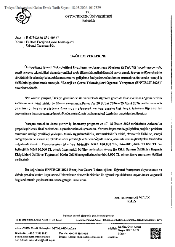 EN2TECH ENERJİ VE ÇEVRE TEKNOLOJİLERİ ÖĞRENCİ YARIŞMASI HK.
