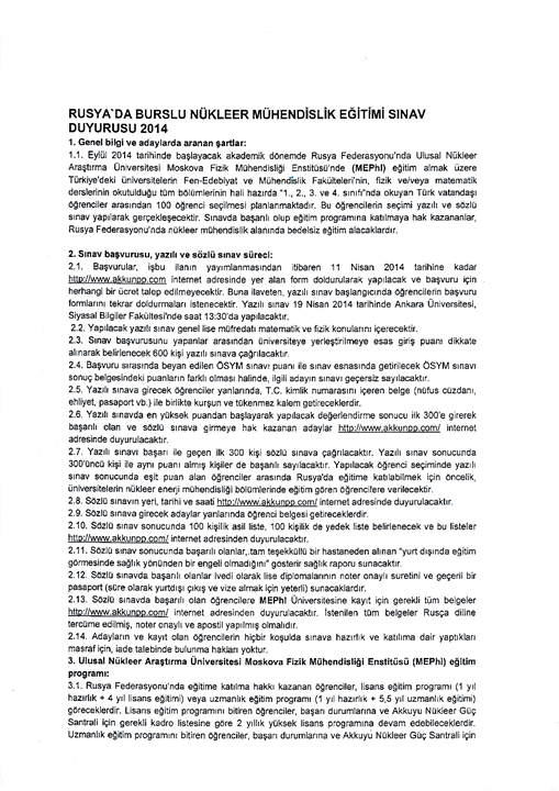 Enerji ve Tabii Kaynaklar Bakanlığı tarafından Mephi Üniversitesi’ne burslu öğrenci gönderilmesine ilişkin yazı ekte yer almaktadır.