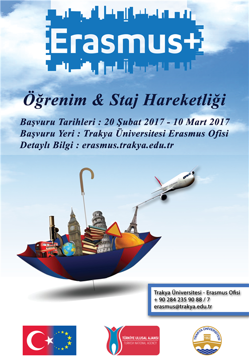 Erasmus+ Öğrenci (öğrenim&staj) Hareketliliği başvuruları 20 Şubat - 10 Mart 2017 tarihleri arasında Dış İlişkiler Birimi-Erasmus Ofisine yapılacaktır. Ayrıntılı bilgi için tıklayınız.