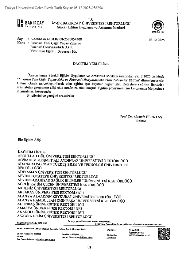 FİNANSIN YENİ ÇAĞI: YAPAY ZEKA VE FİNANSAL OKURYAZARLIKLA AKILLI YATIRIMLAR EĞİTİMİ DUYURUSU HK.