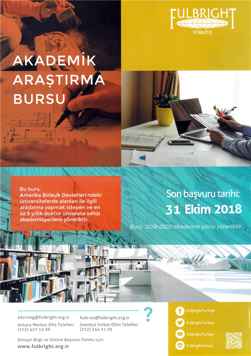 Türkiye ve Amerika Birleşik Devletleri arasında 1949 yılında imzalanan ikili anlaşma ile Türk ve Amerikalı üniversite mezunları, araştırmacılar ve bilim adamları arasındaki eğitim ve kültürel değişim programlarını desteklemeyi amaçlayan, “Türkiye-Amerika Birleşik Devletleri Kültürel Mübadele Komisyonu” tarafından oluşturulan “Akademik Araştırma Bursu” için başvurular başladı. Burslar kapsamında, 2019-2020 akademik yılında geçerli olmak üzere Amerika Birleşik Devletleri’nde alanı ile ilgili araştırma yapmak isteyen ve doktora derecesini bursun son başvuru tarihinden en az 5 yıl önce almış akademisyenlere yönelik “Akademik Araştırma Bursu” için son başvuru tarihi 31 Ekim 2018.
