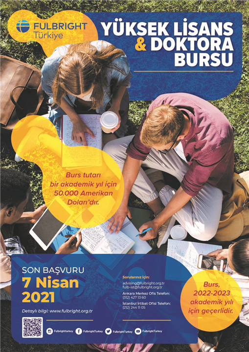 Fulbright Eğitim Komisyonu lisans eğitimi sonrası, lisansüstü eğitimlerini Amerika Birleşik Devletleri’nde görmek isteyen öğrencilere ve mezunlara yönelik olarak Yüksek Lisans, Doktora ve Prof. Dr. Aziz Sancar Doktora Bursları’nı vermektedir. 2022-2023 Akademik Yılı Güz Dönemi’nde başlamak üzere verilecek olan burslarına son başvuru tarihi 7 Nisan 2021’dir.