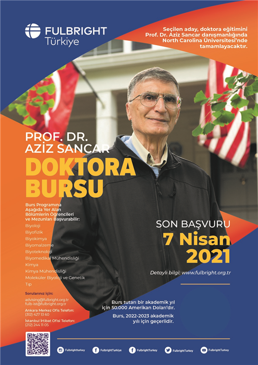 Prof. Dr. Aziz Sancar Doktora Bursunu kazanan öğrenciler Prof. Dr. Aziz Sancar'ın akademik danışmanlığında, kendisinin görevli olduğu University of North Carolina-Chapel Hill Kampüsü'nde doktora eğitimlerine devam edeceklerdir. Prof. Dr. Aziz Sancar Doktora Bursu'na başvurular Biyoloji, Biyofizik, Biyokimya, Biyomalzeme, Biyoteknoloji, Biyomedikal Mühendisliği, Kimya, Kimya Mühendisliği, Moleküler Biyoloji ve Genetik ile Tıp alanlarından kabul edilmektedir.