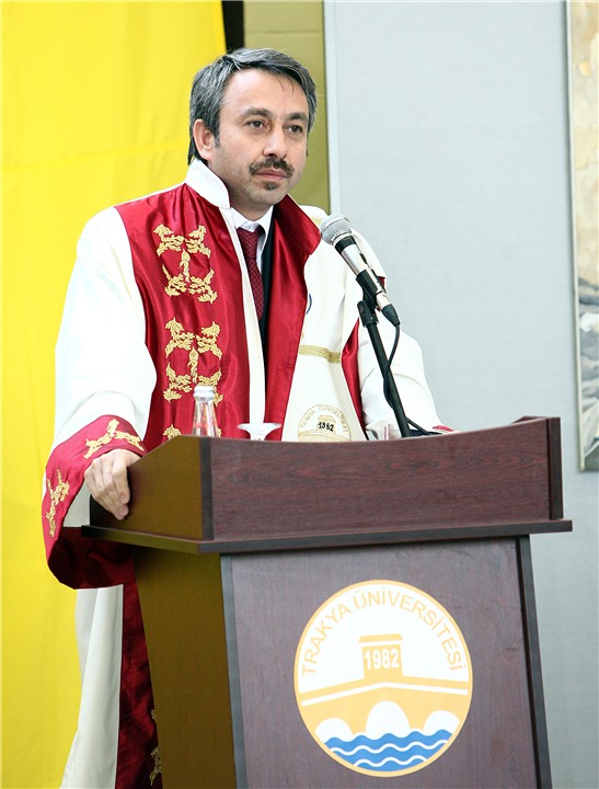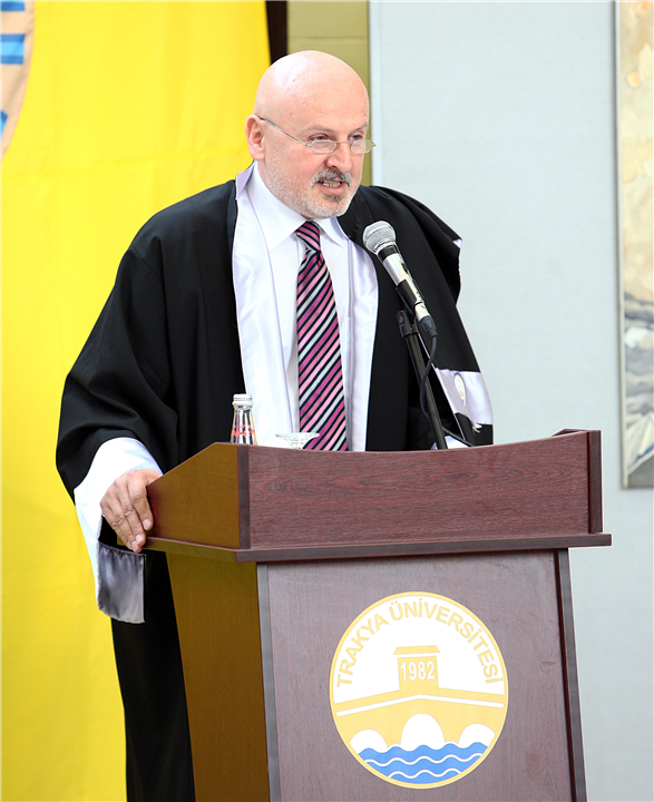 Üniversitemiz Rektörü Prof. Dr. Yener YÖRÜK konuşmasında çok farklı bir mekanda mezuniyet töreni yapmanın güzelliğini vurguladı. Ayrıca bu yapının mimarı, Mimar Kemalettin’i anmak gerektiğini belirtti. Prof. Dr. Yener YÖRÜK, öğrencilerin okudukları yer itibariyle çok şanslı olduklarını söyledi, "Sanatınızı yaparken ruhlarındaki özgünlüğü içinde yaşadıkları toplumun değerleriyle harmanlayarak sanatta kalıcılığı yakalayabilirsiniz." dedi. Rektör Prof. Dr. Yener YÖRÜK konuşmasının sonlarına doğru Balkan Savaşlarında Karaağaç’ta şehit olan Hasan Rıza'yı da anarak, Şehit Hasan Rıza Müzesi için Güzel Sanatlar Fakültesi Dekanıyla birlikte çalışmalar yürüttüğünü belirtti.