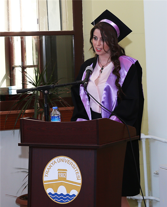 Saygı duruşu ve İstiklâl Marşı ile başlayan törende, mezuniyet konuşmasını dönem birincisi Canan Kolcu gerçekleştirdi.