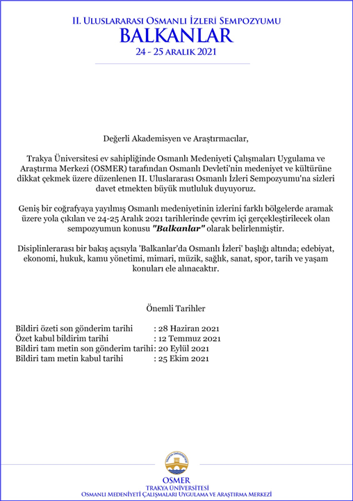 Trakya Üniversitesi ev sahipliğinde, Osmanlı Medeniyeti Çalışmaları Uygulama ve Araştırma Merkezi (OSMER) tarafından 24-25 Aralık 2021 tarihlerinde "Balkanlar" teması ile “II. Uluslararası Osmanlı İzleri Sempozyumu” düzenlenecektir.