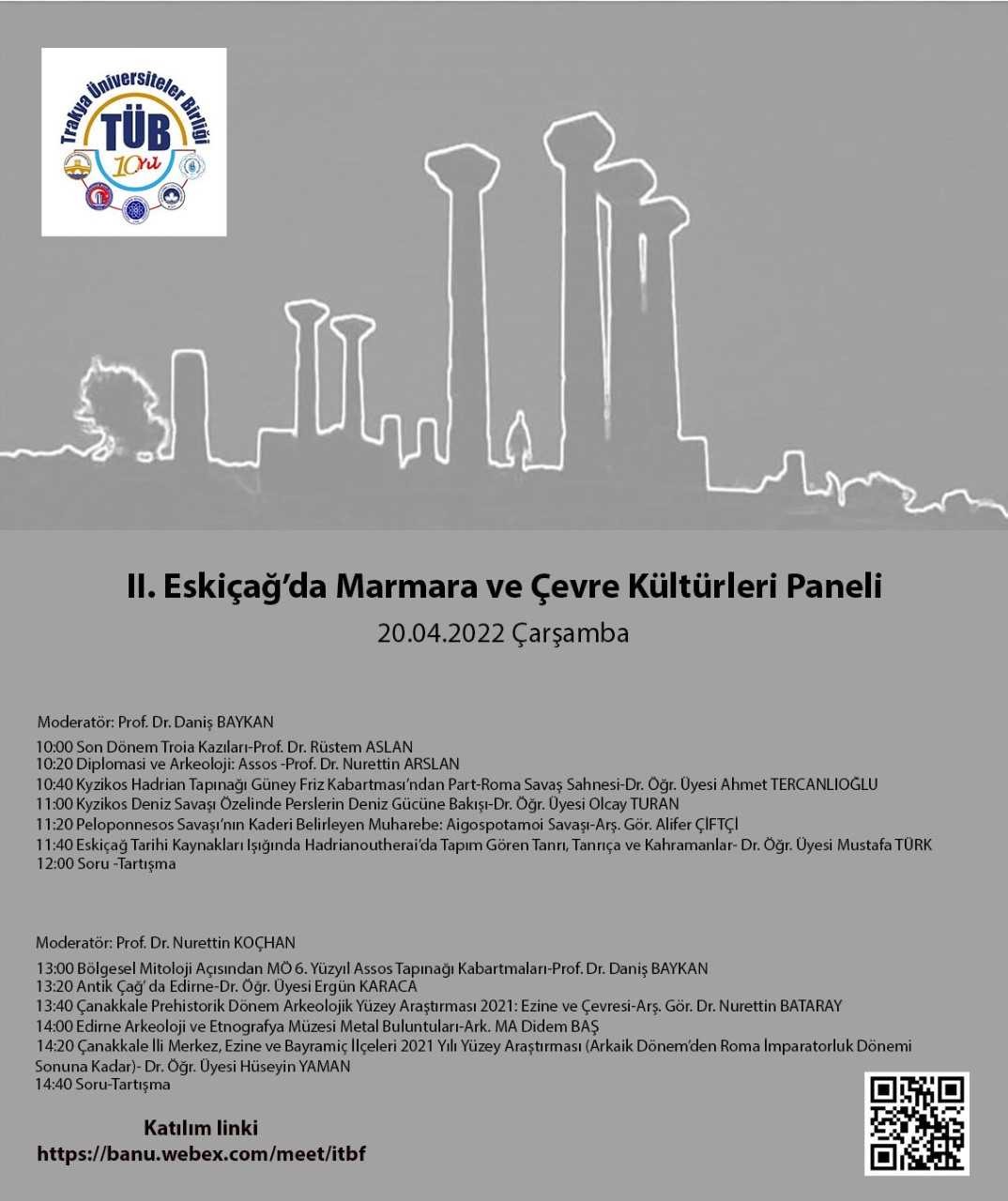 Trakya Üniversiteler Birliği (TÜB) tarafından Bandırma Onyedi Eylül Üniversitesi ev sahipliğinde, 20 Nisan 2022 Çarşamba günü saat 10.00'da Webex uygulaması üzerinden "II. Eskiçağ'da Marmara ve Çevre Kültürleri Paneli" düzenlenecektir.