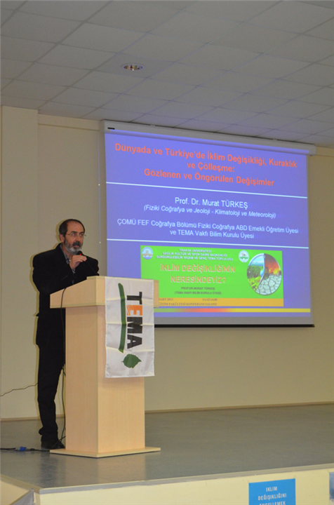 Konferansı veren TEMA Vakfı Bilim Kurulu Üyesi Prof. Dr. Murat TÜRKEŞ, atmosfere salınan karbondioksit gazının sıcaklığı artırdığını söyledi. Prof. Dr. Murat TÜRKEŞ sözlerine şu şekilde devam etti; “Özellikle Sanayi Devrimi ile birlikte bu salınımda büyük bir artış gözlenmiştir. Sera gazı salınımı ve yüzey sıcaklığı giderek artacaktır. 21.yy için sera gazı salınım senaryolarına dayalı model projeksiyonlara göre önümüzdeki yüzyılda yüzey sıcaklığı 2 ile 4.5 derece arasında artacaktır.” Sera gazı salınımının artmasıyla oluşan küresel anlamdaki sıcaklık artışının küresel boyutta bir iklim değişikliğine de neden olduğunu ve olacağını ifade eden Prof. Dr. Murat TÜRKEŞ, ekosistemlerin varlığını koruyabilmek için herkese görev düştüğünü belirtti.