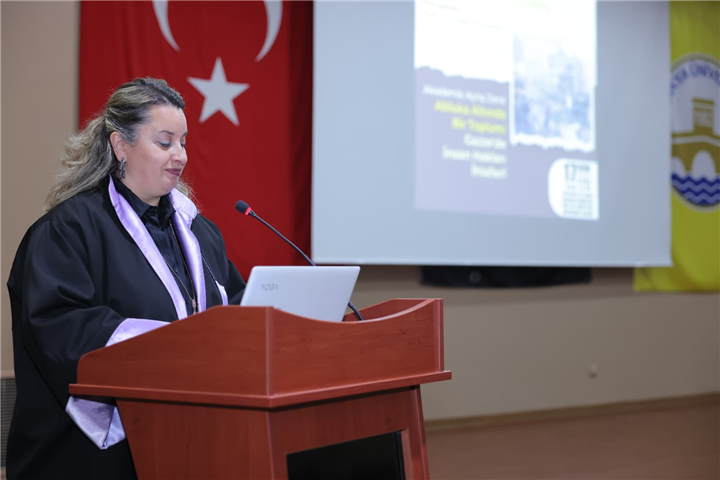 Rektör Yardımcısı Prof. Dr. Eylem Bayır ise üniversitelerin yalnızca bilimsel bilgi üretip aktarmakla kalmayıp, vicdan, adalet ve insanlık onurunun savunulduğu platformlar olduğunu belirtti. Bayır, akademisyenlerin ve öğrencilerin toplumsal sorunlara duyarlı olması gerektiğini vurgulayarak, bu akademik yılın ilk dersinin Gazze’deki insan hakları ihlallerine ayrılmasının önemine değindi.