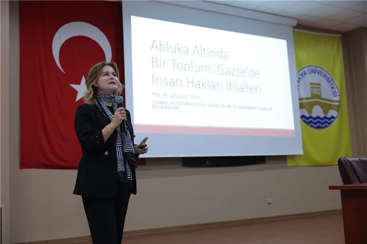 Konuşmaların ardından İstanbul Kültür Üniversitesi Siyaset Bilimi ve Uluslararası İlişkiler Bölümü Başkanı Prof. Dr. Çağla Gül Yesevi, “Abluka Altında Bir Toplum: Gazze’de İnsan Hakları İhlalleri” başlıklı akademik yıl açılış dersini verdi. Yesevi, insanlık onuru, akademisyenlerin toplumsal sorumluluğu ve öğrencilerin farkındalık bilinci üzerinde dururken, ayrıca Filistin ve İsrail’in tarihsel süreci, kimlik bilinci, toprak paylaşımı, siyonizm ve İsrail’in kuruluşu ile Filistin topraklarındaki süren gasp, şiddet ve insan hakları ihlallerine değindi.
