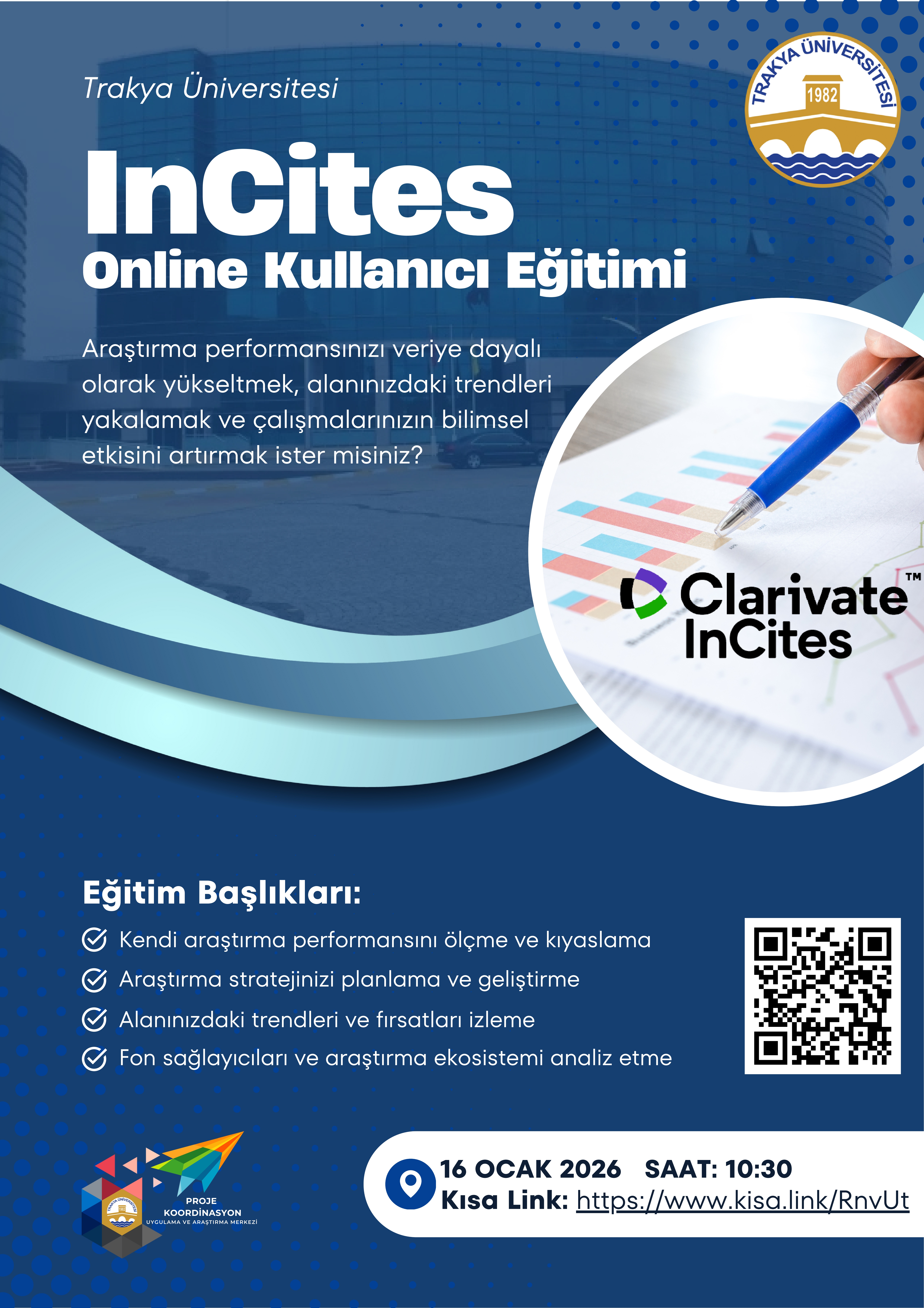 Araştırma performansınızı yalnızca yayın sayısıyla değil, etki, kalite ve görünürlük göstergeleriyle değerlendirmek ister misiniz? Üniversitemiz araştırmacılarının kullanımına sunulan InCitesAraştırma Değerlendirme Platformu ile kendi araştırma performansınızı ölçebilir ve kıyaslayabilir, proje ve araştırma stratejinizi planlayabilir ve geliştirebilir, alanınızdaki trendleri ve fırsatları izleyebilir, dergi ve yayın seçimi için veri desteği alabilir, işbirliği ve ağ analizi yapabilir, fon sağlayıcıları ve araştırma ekosistemlerini analiz edebilirsiniz.