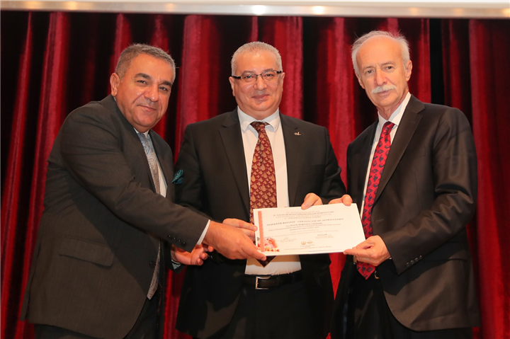 Dinletinin ardından sempozyuma verdiği desteklerden dolayı Kilim Grubu Kartaltepe Mensucat Fabrikası Genel Müdürü Nadir Kartal’a, Rektör Yardımcısı Prof. Dr. Mustafa Tan tarafından teşekkür belgesi takdim edildi.