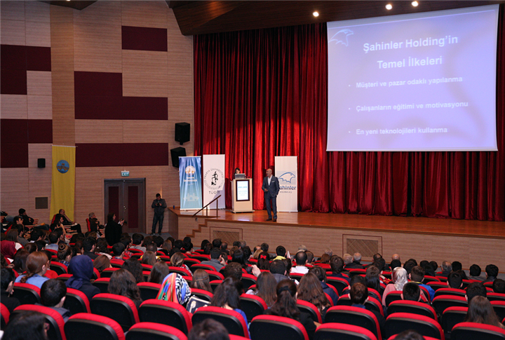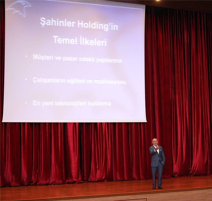 Katılımcılara kendi yaşam öyküsünü anlatarak konuşmasına başlayan Şahin, başarılarla dolu girişimcilik öyküsünü dinleyenlerle paylaştı ve hayatta başarı veya başarısızlığın tesadüfi olmadığını söyledi. Şahin çalışma hayatında en önemli prensibin insanları anlamak olduğunu belirterek, doğru iletişimin önemine dikkat çekti ve konuşmasında bir yönetici olarak bütün çalışanlarını ve müşterilerini anlamaya gayret ettiğini belirterek, gelecekte vizyon sahibi şirketlerin başarıyı yakalayacağını söyledi. Kemal Şahin konferans sonunda öğrencilerin sorularını yanıtladı.