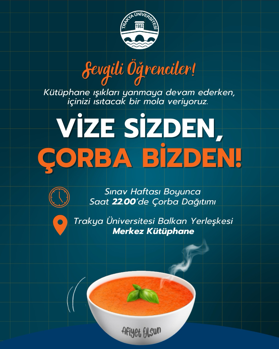 Bu gece başlayacak uygulama kapsamında, sınav dönemi süresince her akşam saat 22.00’de kütüphanede ücretsiz çorba dağıtımı yapılacaktır.