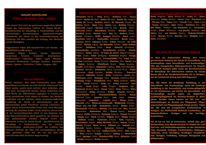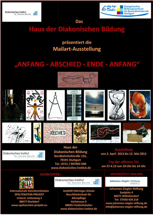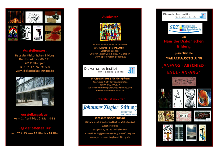 Küratörlüğünü Matthias Brugger’in yaptığı "Başlangıç - Veda - Son - Başlangıç" adlı Mail Art Projesinin ilk sergisi Stuttgart Diakonisches Enstitüsünde düzenlendi. Dünyanın birçok ülkesinden katılımın olduğu sergiye ülkemizden Trakya Üniversitesi Güzel Sanatlar Fakültesi Resim Bölümü öğretim elemanı Öğr. Gör. Dr. Deniz Gökduman ve 4. sınıf öğrencileri Bensu Altay, Çiğdem Gökçeciler, Damla Bozkurt, Elçin Topçu, İ.Boran Kabzımal, M. Emin Küçük, H.Teoman Furat ve Tolga Temel katıldı.