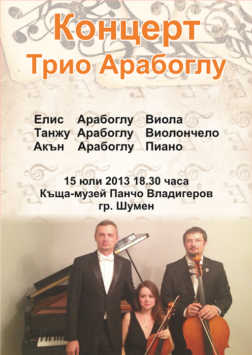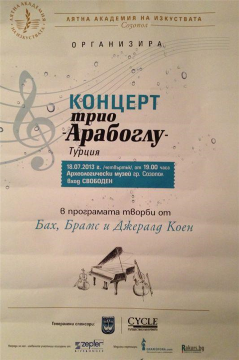 Üniversitemiz Devlet Konservatuarı Öğretim Üyeleri Yrd. Doç. Akın ARABOĞLU, Yrd. Doç. Tanju ARABOĞLU ve Öğr. Gör. Elis ARABOĞLU, 15 Temmuz 2013 tarihinde Şumnu’da ve 18 Temmuz 2013 tarihinde Sozopol’de olmak üzere Bulgaristan’da iki konser verdiler. Aynı zamanda, öğretim üyelerimiz Bulgaristan basınında, yerel gazetelerde, internet gazetelerinde ve Bulgaristan Ulusal Kanalı BNT’nin (Българска национална телевизия (Бнт) ) haberlerinde yer alırken, Kanal 6’nın (канал 6) “Dilyana Radoslavova ile Özgür Uçuş” (свободен полет с Диляна Радославова ) isimli gençlik programında stüdyo konuğu oldular.