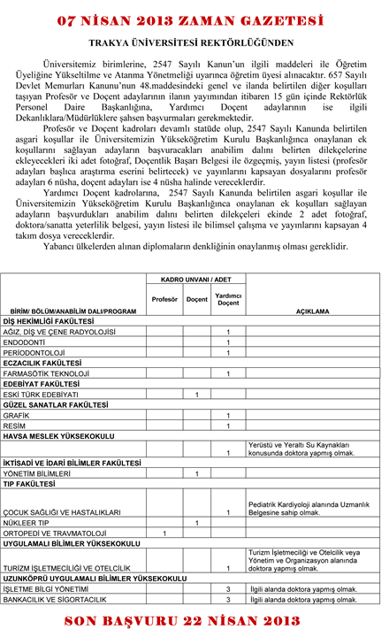 ÖĞRETİM ÜYESİ ALIM İLANI 07.04.2013