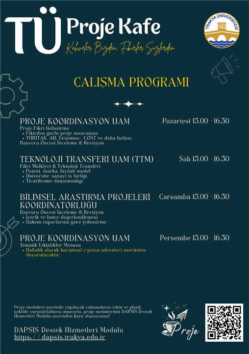Trakya Üniversitesi bünyesinde, proje fikirlerinin geliştirilmesi ve nitelikli, sürdürülebilir projelere dönüştürülmesini desteklemek amacıyla Proje Kafe uygulaması hayata geçirilmektedir.