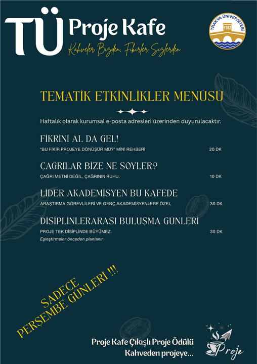 “Kahveler Bizden, Fikirler Sizlerden” sloganıyla faaliyet gösterecek olan Proje Kafe; akademisyenler, araştırmacılar ve proje fikri bulunan tüm paydaşlar için disiplinler arası etkileşimi teşvik eden, danışmanlık ve fikir paylaşımına dayalı bir buluşma ortamı sunmayı amaçlamaktadır.
