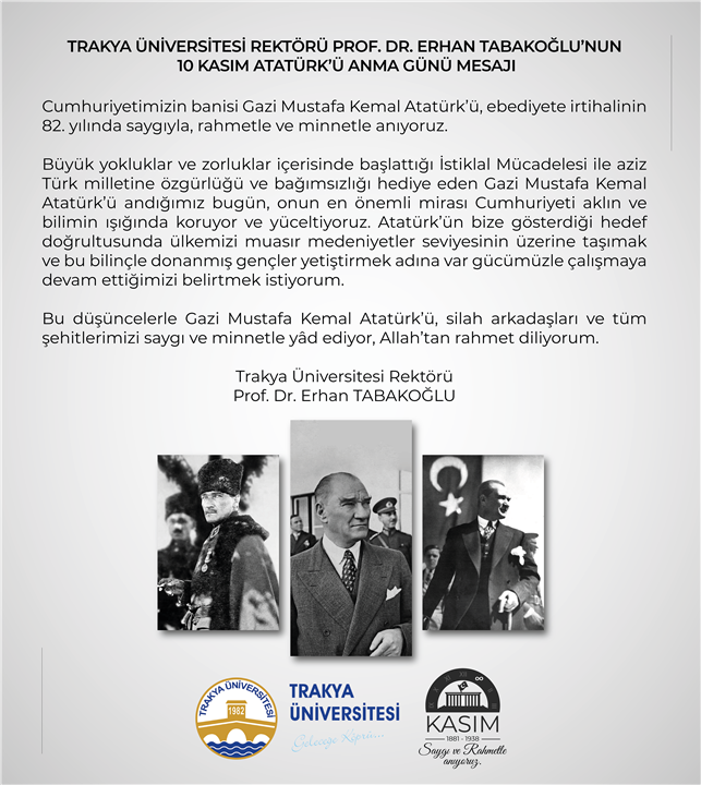 REKTÖR PROF. DR. ERHAN TABAKOĞLU'NUN 10 KASIM MESAJI