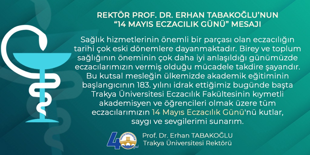 REKTÖR PROF. DR. ERHAN TABAKOĞLU'NUN 14 MAYIS ECZACILIK GÜNÜ MESAJI