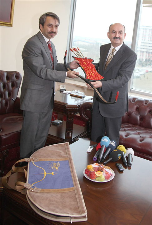 Üniversitemiz Rektörü Prof. Dr. Yener YÖRÜK, Sağlık Bakanı Sayın Dr. Mehmet MÜEZZİNOĞLU’na ziyaretin anısına, bir personelimizin tamamen eski yapım tekniği ile imal ettiği Osmanlı Yayı ayrıca Oklar, Sadak (ok kılıfı), ve zihgir (okçu yüzüğü) takdim etti. Takdim sırasında Üniversitemiz Rektörü Prof. Dr. Yener YÖRÜK, Sağlık Bakanı Sayın Dr. Mehmet MÜEZZİNOĞLU’na kültürümüz ve medeniyetimizin gücü ile hedefleri on ikiden vurması dileğini ifade etti.
