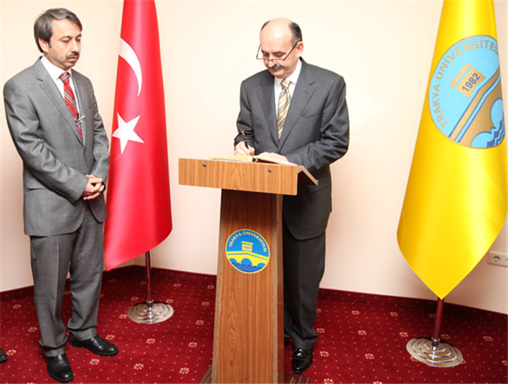 Ardından Üniversitemiz anı defterini imzalayan Sağlık Bakanı Sayın Dr. Mehmet MÜEZZİNOĞLU, anı defterine “ Bugün 9 Şubat 2013 Trakya Üniversitemizin Rektörü Prof. Dr. Yener YÖRÜK Bey’i ve yönetimini ziyarete geldik. Trakya Üniversitemizin Edirne’nin vizyonunda ki önemini kendileriyle paylaştık, kendilerinde gördüğüm heyecan beni mutlu etti. Değerli Rektörümüzün şahsında tüm üniversite yönetimini, hocalarımızı ve öğrencilerimizi tebrik ediyor kendilerine başarılar diliyorum” yazdı.