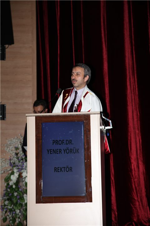 Trakya Üniversitesi Rektörü Prof. Dr. Yener YÖRÜK konuşmasında “Bugün burada bu dönemin ilk mezuniyet töreninde bulunmaktan mutluluk duyuyoruz. Mezun olan öğrencilerimiz çok şanslı çünkü büyük bir sağlık olanağı sunan Trakya Üniversitesi’nden mezun oldular. Balkanların belki de en büyük sağlık kompleksinde, bütün olanakları bulunan hastanesinde çalıştılar. Temel Bilimler alanında çok güçlü olan hocalardan dersler aldılar. İş kaygısını en az yaşayacak olan mezunlar olmaktan dolayı çok şanslılar. Ayrıca Edirne’de okumuş olduklarından, bu tarih kokan şehirde sağlık eğitimi almış olduklarından dolayı da çok şanslılar.” dedikten sonra mezun olan öğrencilere, hastalarını anneleri, babaları, kardeşleri gibi görmelerini ve onlara daima şefkat ile yaklaşmaları gerektiğini vurguladı.