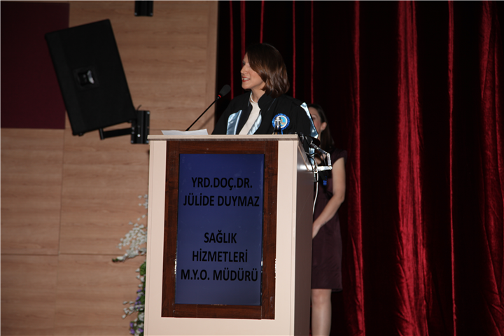 Sağlık Hizmetleri Meslek Yüksekokulu Müdürü Yrd. Doç. Dr. Jülide DUYMAZ konuşmasında “ Sağlık Hizmetleri’nin farklı alanlarına beş bine yakın mezun yetiştirdik bu anlamda ülkede güçlü bir varlık olduk. Ülkemizin öncü okullarından biri olmaya da devam etmekteyiz. “Önemli olan meydan değil, verilen eğitimdir” anlayışını benimseyerek bugünlere gelen okulumuzun fiziki koşullarındaki eksikliklerin giderilmesi hususunda bizlere destek olan herkese teşekkürü borç biliriz.” bu sözlere değindi.