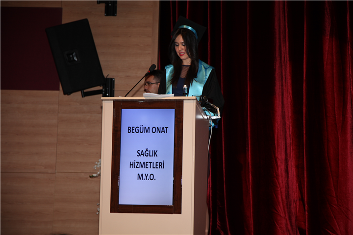 Sağlık Hizmetleri Meslek Yüksekokulu Birincisi Begüm ONAT konuşmasında şunları söyledi: “Bugün mezun oluyoruz. Bir bitse de kurtulsak derdik. İşte bitiyor. Ama biten yalnızca okul değil, içimizden de bir şeyler bitiyor. Omuz omuza, tek yürek olduğumuz arkadaşlarımız, hocalarımız artık ayrılık vakti geldi. Bu süreç için çok güzeldi desem az, çok yorucuydu desem hafif, nasıl başlamıştık desem duygusal olacak. Mustafa Kemal’in yıllar önce gönderdiği gibi birer kıvılcım olarak gidiyoruz ama elbette birer alev olarak döneceğiz. Emeği geçen, elimizden tutan tüm hocalarımıza ve hakları ödenmeyecek ailelerimize çok teşekkür ediyorum.”
