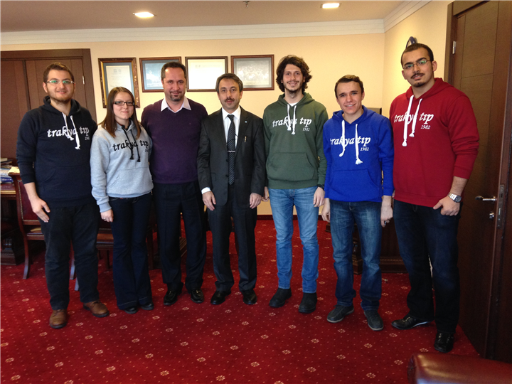 Trakya Üniversitesi Sağlık ve Tıbbi Araştırmalar Topluluğu Bilimsel Araştırma Grubu akademik danışmanı Doç. Dr. Y. Atakan SEZER ve öğrencileri Stj. Dr. Mustafa Reha DODURGALI, Stj. Dr. Oktay DOKUZ, Stj. Dr. Hümeyra DEMİRKIRAN, Stj. Dr. Muhammed Burak SARIKAYA ve Stj. Dr. Cemal KÖKSAL Rektörümüz Prof. Yener YÖRÜK'ü ziyaret etti.