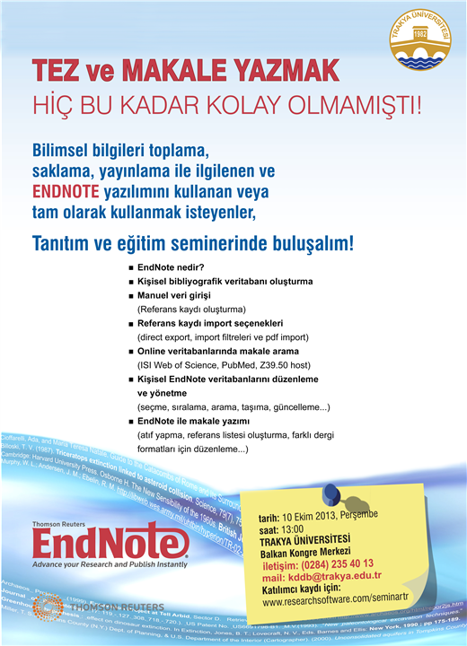 Üniversitemiz Kütüphane ve Dokümantasyon Dairesi Başkanlığınca, tez/makale yazma, atıf yapma, referans listeleri oluşturma ve farklı dergi/tez formatlarına göre düzenleme gibi birçok özelliğiyle bilimsel araştırma sürecine yardımcı olabilecek EndNote yazılımı Trakya Üniversitesi Akademisyen ve öğrencilerini kapsayacak şekilde lisanslanarak kullanımına sunulmuştur.