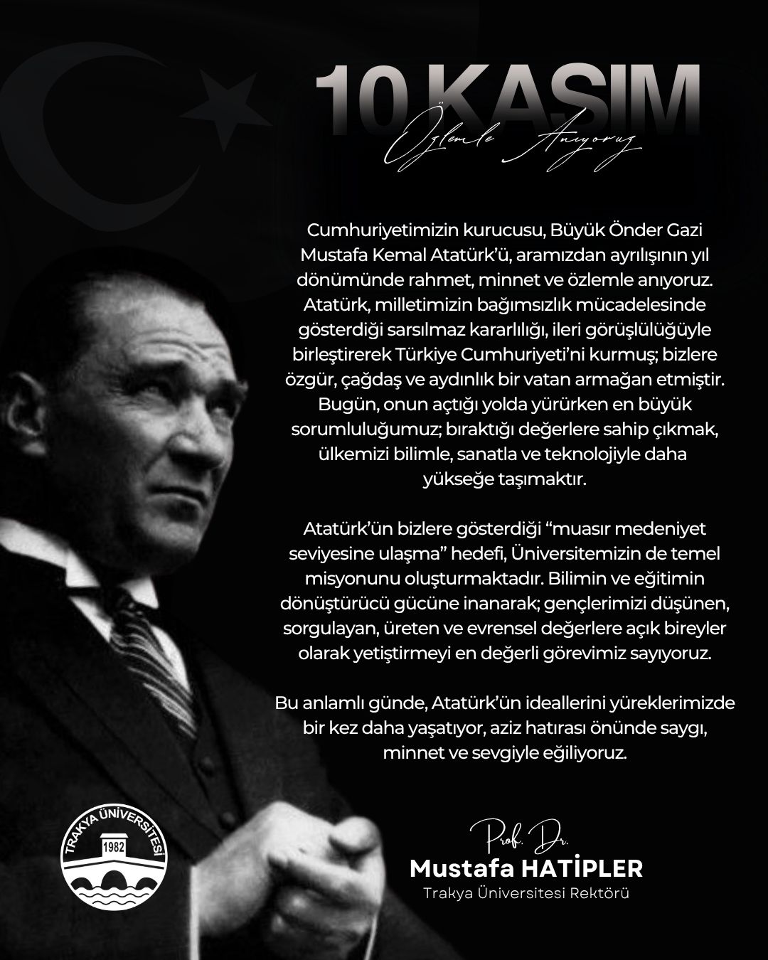TRAKYA ÜNİVERSİTESİ REKTÖRÜ PROF. DR. MUSTAFA HATİPLER’ İN 10 KASIM MESAJI