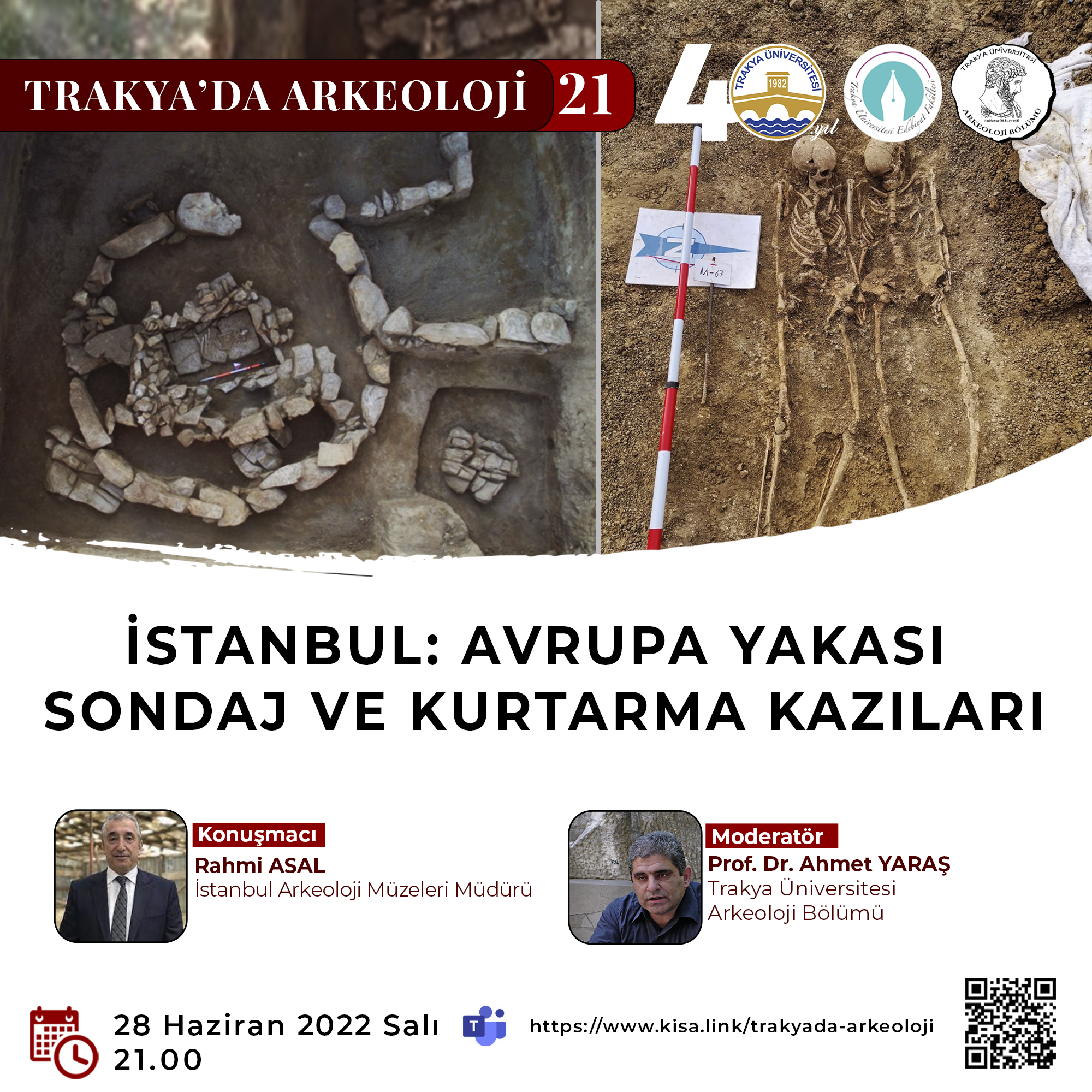 Trakya’da Arkeoloji konferans dizimizde, 14.06.2022 Salı günü Saat 21.00 de İstanbul Arkeoloji Müzeleri Müdürü Sn Rahmi ASAL İstanbul’un Avrupa Yakasındaki Arkeolojik Kazı ve Sondajları anlatacağı sunumla devam edecek. İstanbul Arkeoloji Müze uzmanlarının Trakya’da yapmış olduğu kazı ve sondajlarda önemli bulgu ve verileri arkeoloji meraklılarını bekliyor olacak.