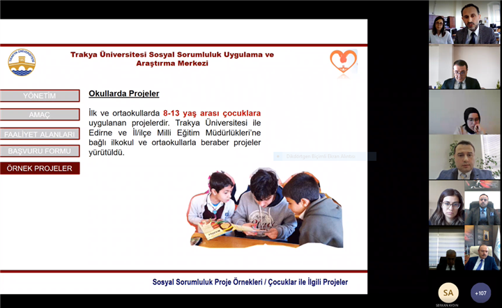 Trakya Üniversitesi bünyesinde bir Sosyal Sorumluluk Uygulama ve Araştırma Merkezi kurduklarını da hatırlatan Rektör Prof. Dr. Erhan Tabakoğlu “Trakya Üniversitesi olarak fikirler ve projeler üretmek, bu proje ve fikirlerin toplum yararına sunulmasını sağlamak amacıyla bir merkez oluşturduk. Merkezimizin katkılarıyla bir şehir üniversitesi olarak kent ile bütünleşen ve toplumun her alanında sürekli gelişimine katkıda bulunacak projeler hayata geçiriyoruz. Bugüne kadar Geleceğim Sensin Koro ve Orkestrası, Çocuk Akademisi Tasarım Beceri Atölyeleri, Sokak Hayvanları İçin Barınak Tasarım ve Üretimi, 40 Kadın 40 Eser, Mutlu Kadın Mutlu Aile Mutlu Toplum gibi toplumun her kesiminden bireylere ve aynı dünyayı paylaştığımız canlılara hitap edecek, gönüllere dokunacak pek çok proje ürettik ve üretmeye devam ediyoruz. Çocuklar, yaşlılar, özel gereksinimli bireyler başta olmak üzere toplumun tüm kesimlerini ilgilendiren konularda kurumlarımızla iş birliği içinde farkındalık oluşturmaya, ihtiyaçlarını anlamaya ve destek olmaya devam edeceğiz.” ifadelerini kullandı.